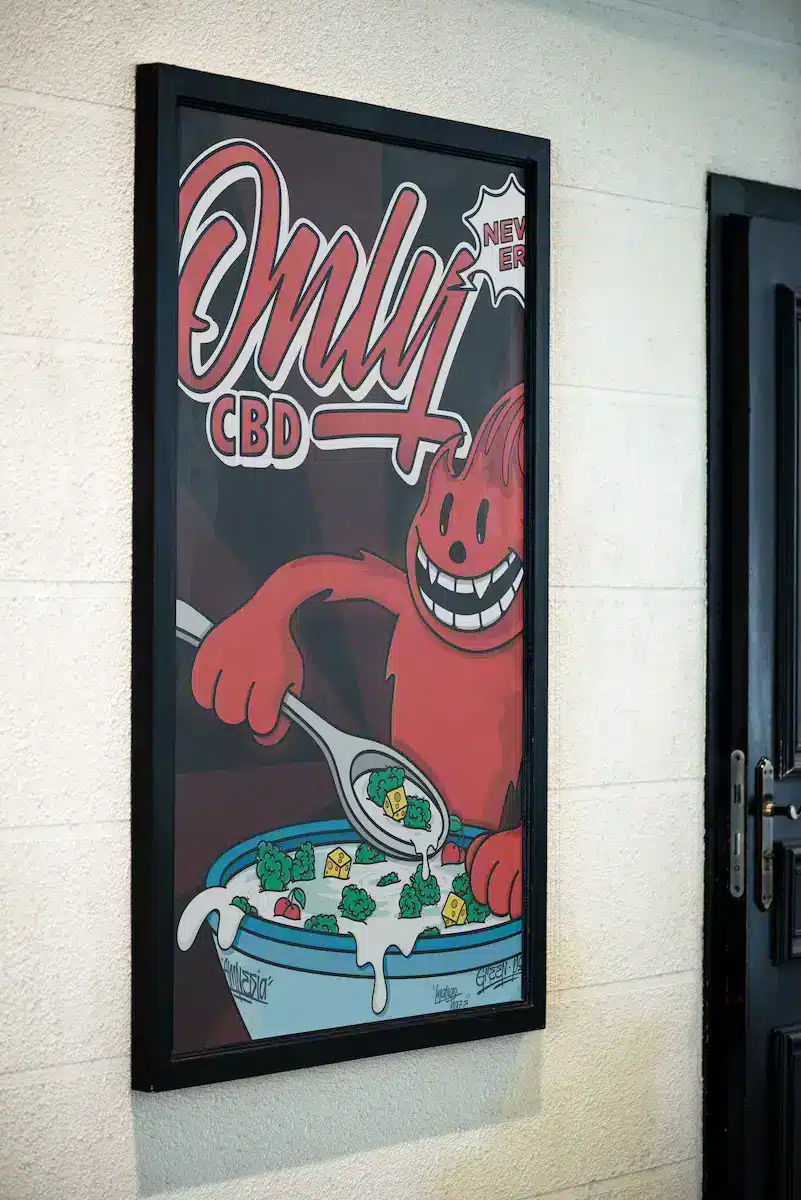 Illuminez vos murs avec l'étincelle de cette affiche "OnlyCBD". dans le plus pur style Nouvelle ère! Capturez le essence rebelle et vibrante CBD avec une touche espiègle. Cette affiche met en scène un Flamito espiègle plongeant dans un bol de céréales vertes, interdit aux enfants. Avec son clin d'œil à la culture jeune et son esthétique résolument indépendante, cette affiche est parfaite pour donner une touche d'originalité à n'importe quelle pièce. Si vous êtes quelqu'un qui suit les tendances et qui les crée, cette affiche est faite pour vous !